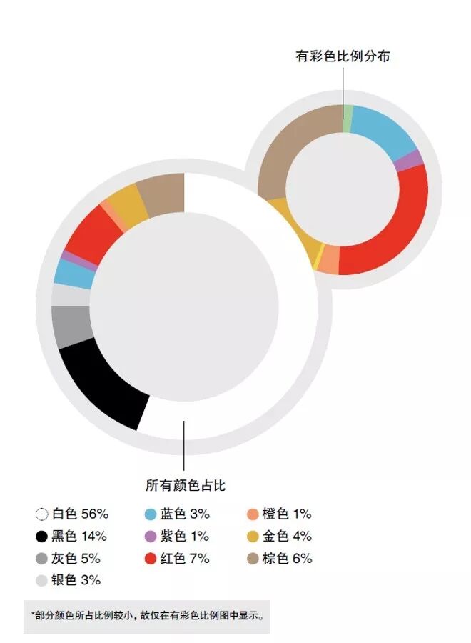 从全球来看,白色在所有细分领域遥遥领先,以接近40%的市场份额继续保持首选颜色的地位不变;并与黑色、灰色和银色等其它中性色共同占据市场主流。在有彩色中,蓝色和红色的份额不相上下,棕色紧随其后。